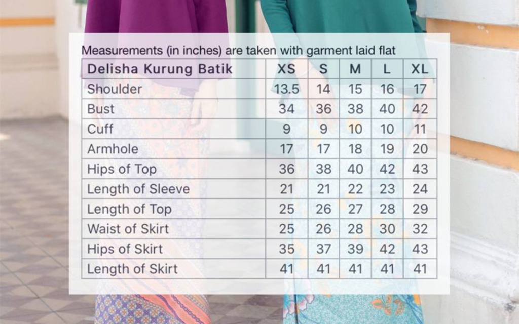 Saiz yang tersedia untuk Delisha Kurung Batik ini adalah saiz XS, S, M, L, dan XL, sila rujuk table dalam ukuran inci pada gambar di bawah: