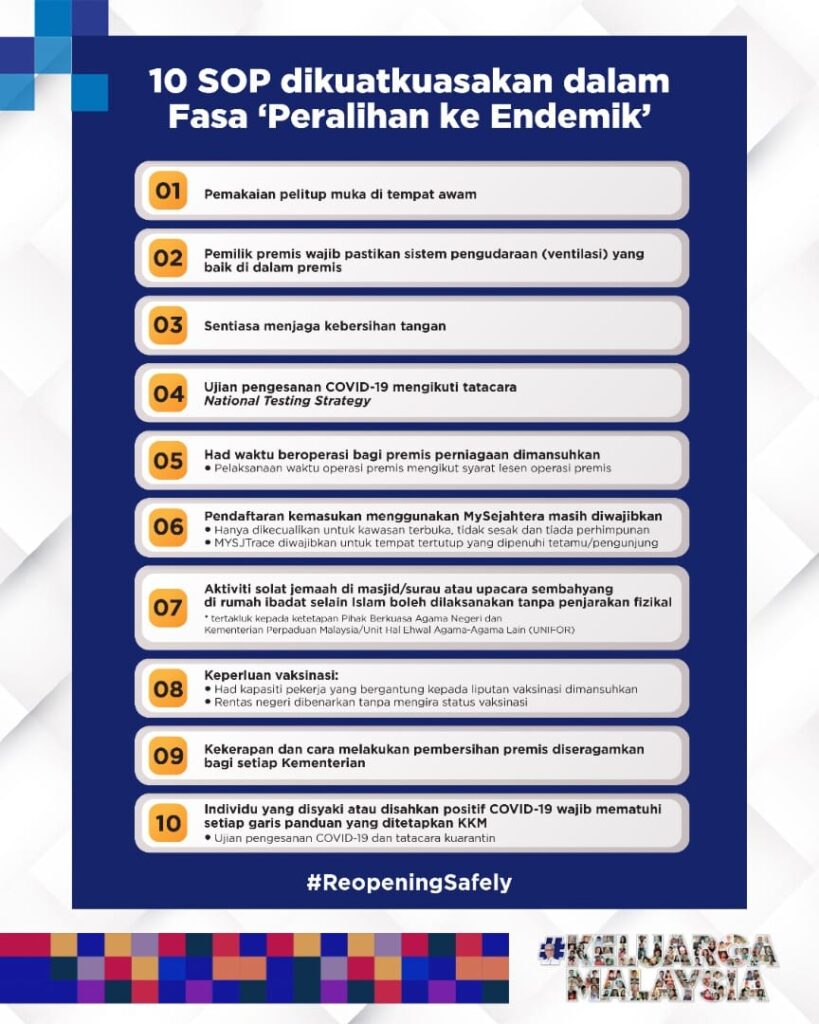 Walaupun demikian, sangat penting untuk kita kekal dengan amalan-amalan standard operating procedure (SOP) yang telah ditetapkan untuk mengurangkan risiko-risiko daripada dijangkiti oleh Covid-19 ini.